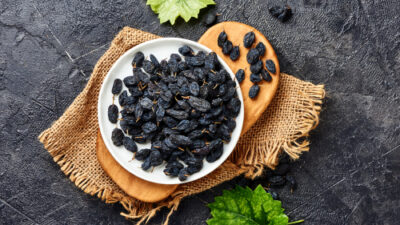 Black raisins are of sweet fruity taste and soft chewy texture frequently used in smoothies and desserts because they include essential elements such as vitamins, minerals, antioxidants and dietary fibers.